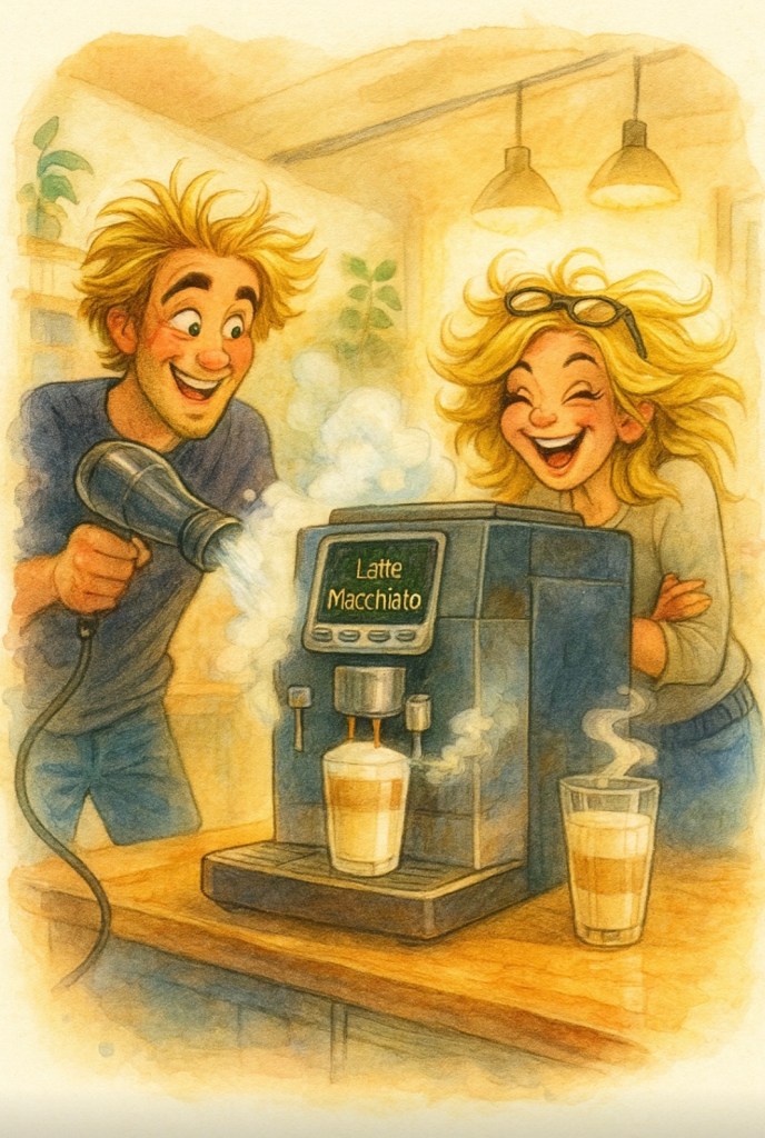 Denn diese Maschine… unfassbar… will… angeföhnt werden. Ja, richtig… Mit einem Föhn. Ehrlich… Keine Ahnung warum. Irgendwo im Inneren scheint eine Leitung zu frieren, eine Klappe klemmt, ein Sensor beschließt: „Ohne warme Luft geht hier gar nichts. „ Und so stehe ich da. Mit Föhn. In der Küche. Vor der Kaffeemaschine. Noch im Schlafoutfit. Und föhne. FÖHNE! Das Herzstück meiner Küche, mein Heiligtum, braucht morgens erst mal ein Styling.